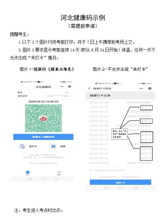 2.凭《准考证》、身份证和《身体健康状况监测记录表》(或打印的“河北健康码”及14天健康记录截图),按规定时间和地点参加考试。应主动接受监考人员和考试工作人员按规定进行的身份验证、身体健康监测和对随身物品等进行的必要检查。佩戴口罩的考生,在接受检查时须摘下口罩。因装有心脏起搏器等不宜进行金属探测器检查的考生,应在检查前声明,并出示县级以上医院出具的证明,如不提前声明,后果自负。